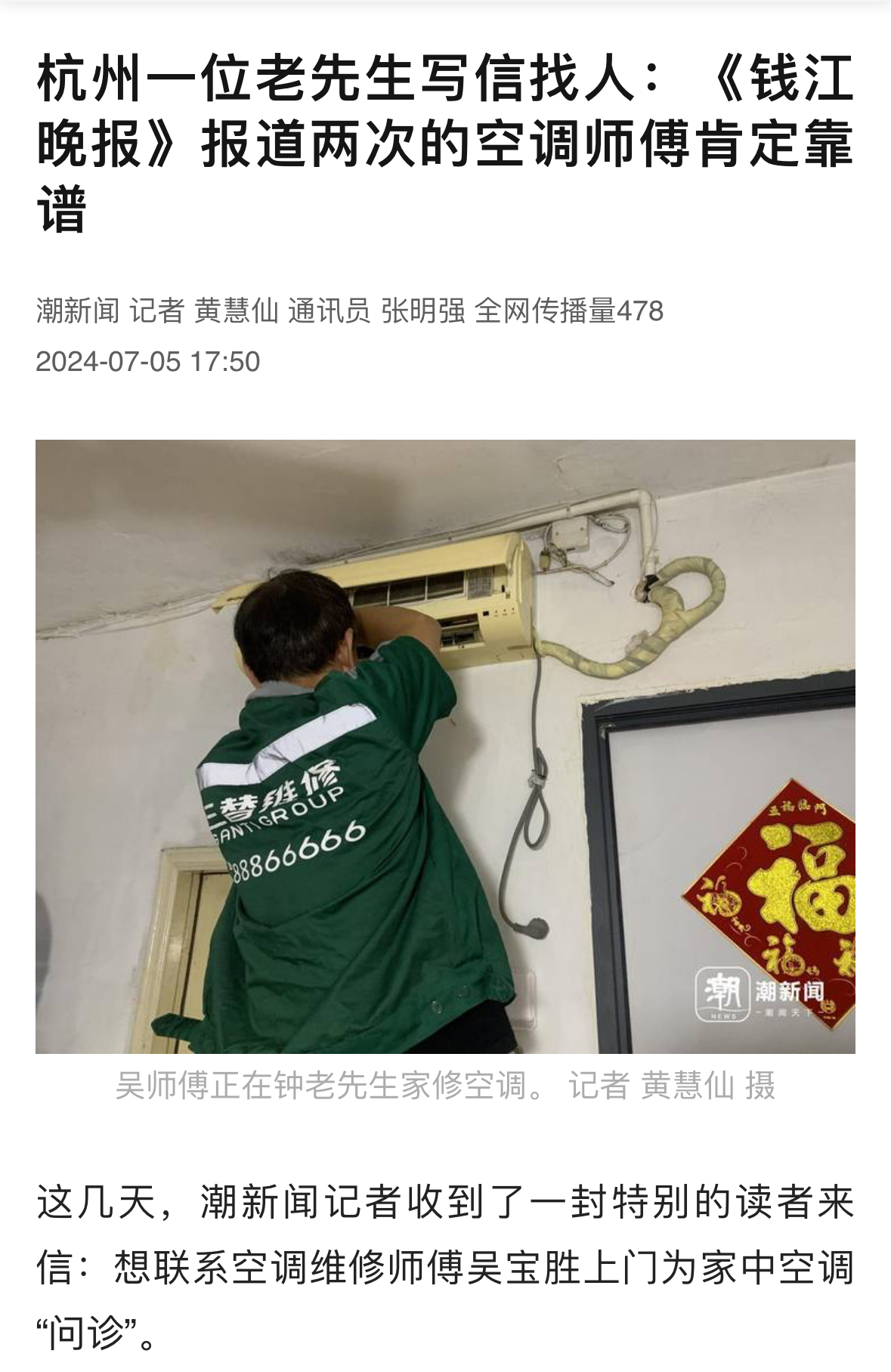 這幾天,潮新聞記者收到了一封特別的讀者來信:想聯系空調維修師傅吳寶勝上門為家中空調“問診”。這事源于前不久《錢江晚報》刊登的《梅雨天,記者跟隨老師傅專治空調病》一文。此前報道:奔忙在風里雨里日頭下,一個夏天要修上千臺,56歲空調維修工的日常寫信者鐘老先生是杭十四中一名退休英語老師,今年79歲,平時獨居在家。家中有一臺年代較久遠的國產空調出現遙控失靈的情況,老先生一直想找人維修,但又覺得廣告推薦的維修工優劣難辨,擔心受騙上當。因此,維修事宜一直從年初拖到現在。