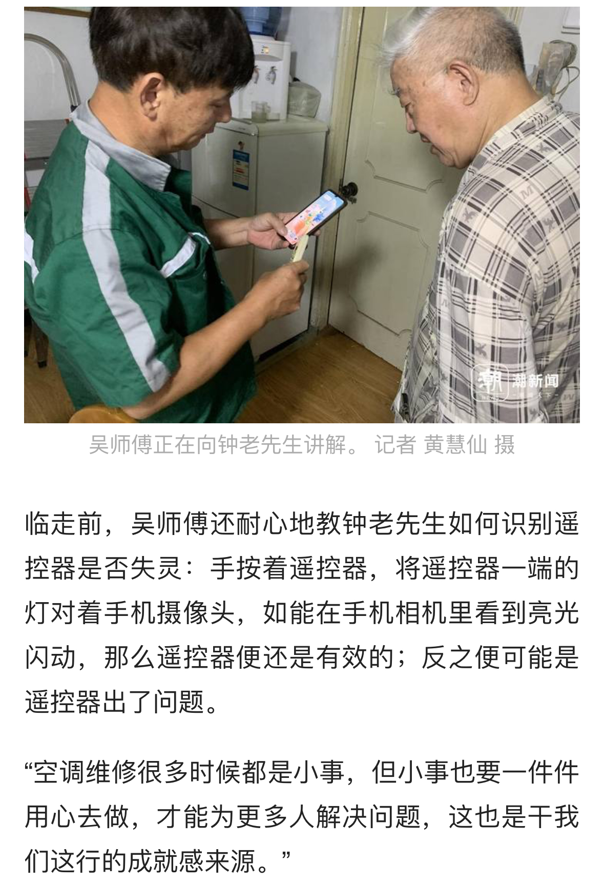 臨走前,吳師傅還耐心地教鐘老先生如何識別遙控器是否失靈:手按著遙控器,將遙控器一端的燈對著手機攝像頭,如能在手機相機里看到亮光閃動,那么遙控器便還是有效的;反之便可能是遙控器出了問題。